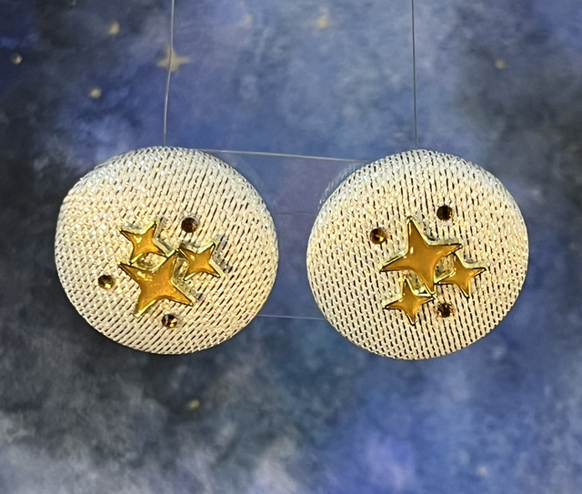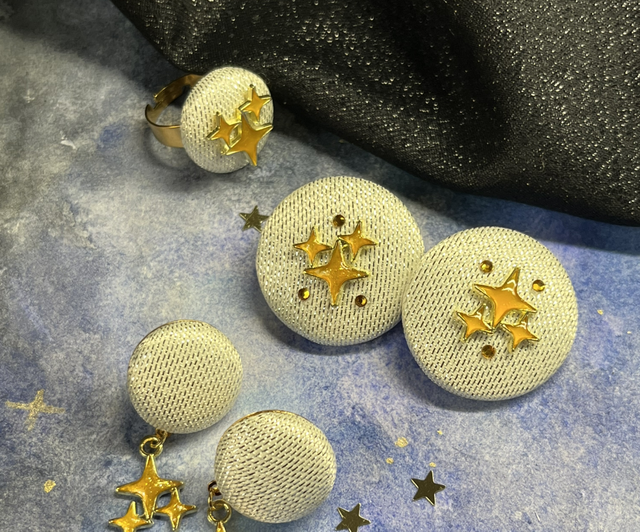 Ce modèle de boucles d'oreilles est composé d'une Sidonie en tissu doré, surmontée d'étoiles jaune avec strass dorés