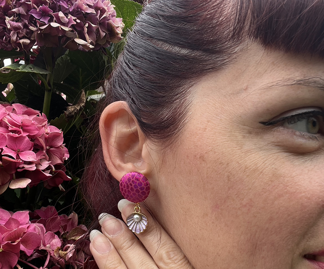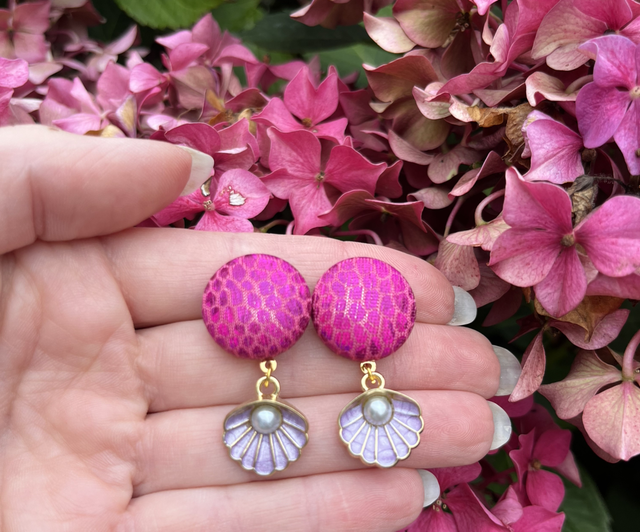 Ces boucles d’oreilles incarnent l’élégance vintage et l’esprit pin-up, dans un thème "bord de mer" parfaites pour pour l'été. Elles apporteront une touche rétro et sophistiquée à n’importe quelle tenue estivale. Ce modèle confectionné dans un tissu rose holographique esprit "écailles de sirène" sera girly à souhait !
