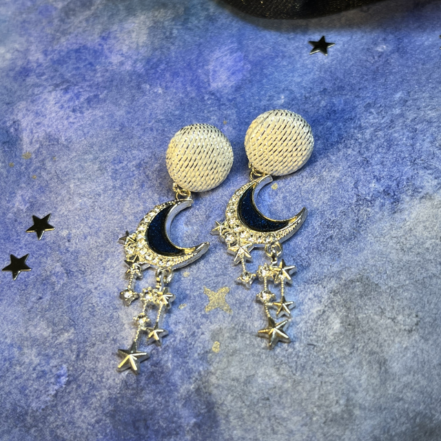 Ce modèle de boucles d'oreilles est composé d'une Babys en tissu argenté et sa breloque lune bleu et argenté avec strass et étoiles.