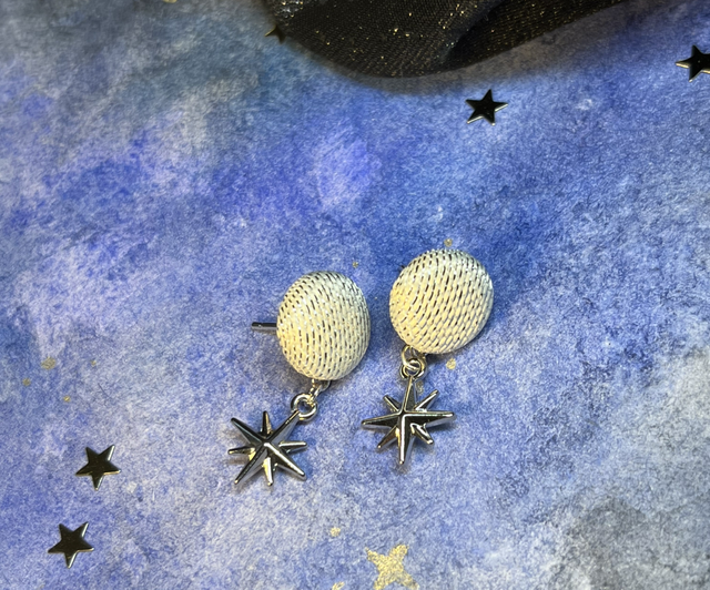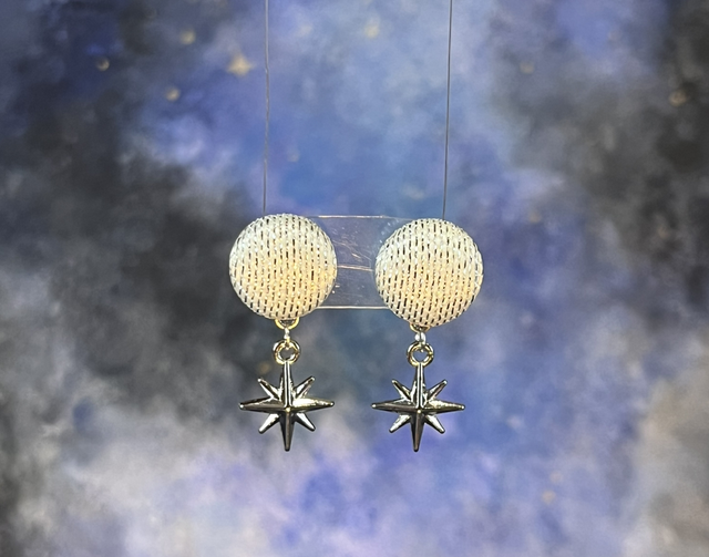 Ce modèle de boucles d'oreilles est composé d'une Babys en tissu argenté et sa breloque étoiles argentée.