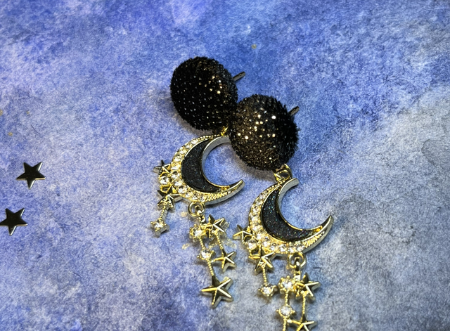 Ce modèle de boucles d'oreilles est composé d'une Babys en tissu noir à paillettes et sa breloque lune noir et doré avec strass et étoiles.